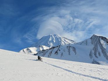 Корякский и Авачинский вулканы находятся рядом друг с другом, добирались мы до них также с нашими гидами на внедорожниках и снегоходах. Авачинский вулкан действующий - от его вершины поднимаются рожки белого дыма.